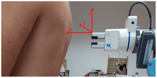 When the robot reaches an auscultation point, it moves towards the person’s back (at a speed of 0.2 m/s and acceleration of 0.2 m/s), while the force it applies to the tip of the gripper is monitored along the x axis represented in Figure 13. Whenever this force exceeds the force initially received (when the robotic arm reached the auscultation point) by 3 N, it stops for 10 s (simulates auscultation). Next, the robotic arm moves away from the person’s back and continues to the next point.