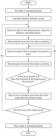 To obtain the force applied to the tip of the gripper, the real-time data exchange (RTDE) interface is used. This interface provides a way to collect information from the robotic arm, allowing synchronizing variables that can be chosen by the client to be written and read, which must be contained in the actual synchronization’s instruction packet. Each instruction has a unique ID. The RTDE control package setup outputs returns the values of the variables, in the same order in which they were requested. The RTDE was initialized on port 30004 (the host was the IP of the robotic arm) and with a frequency of 125 Hz. Figure 14 presents the flowchart of this algorithm.