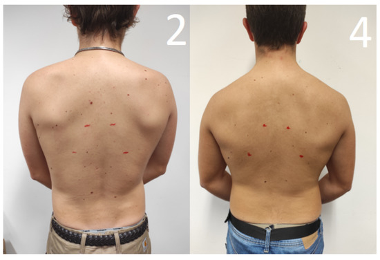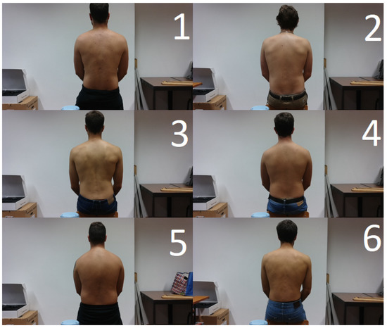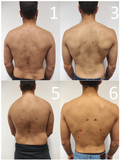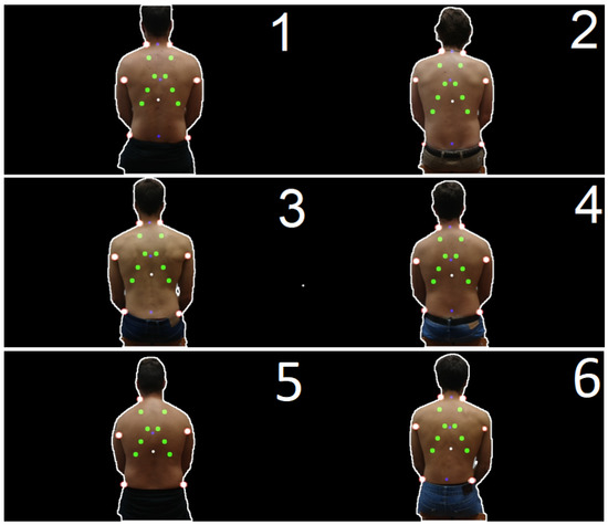Next, the frames of the six patients’ backs used in this test were obtained (see Figure 16), as well as their respective extractions from the image background (see Figure 17) and the key points were predicted using the trained prediction model, as illustrated in Figure 17 (white points).
