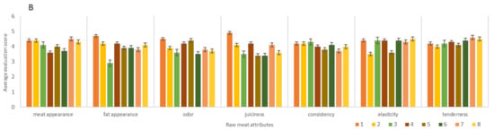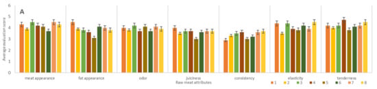 Yeasts supplemented broiler’s breast (A) and thigh (B) meat sensorial attributes. 1—Negative control group–fed with basal diet (Corn-soybean meal); 2—Basal diet + SC 0.6 g/kg feed; 3—Basal diet + SC 1.0 g/kg feed; 4—Basal diet + SC 1.3 g/kg feed; 5—Positive control group–fed with basal diet (Corn-soybean meal) + RM (0.3 kg/t feed); 6—Basal diet + SC 0.6 g/kg feed + RM (0.3 kg/t feed); 7—Basal diet + SC 1.0 g/kg feed + RM (0.3 kg/t of feed); 8—Basal diet + SC 1.3 g/kg feed + RM (0.3 kg/t feed).
