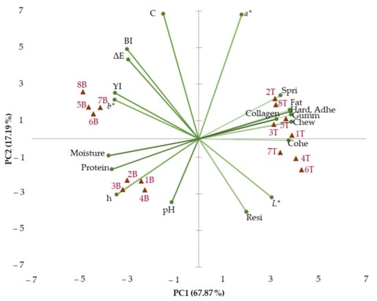 Principal Component Analysis bi-plot: red triangles represent the chicken groups (B—breast (1–8 groups), T—thigh (1–8 groups)) and green dots represent the variables; Adhe—adhesiveness, Cohe—cohesiveness, Spri—springiness, Gumm—gumminess, Chew—chewiness, Resi—resilience, L*, a*, b*—color parameters.