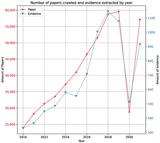Number of papers crawled, and evidence extracted by year.