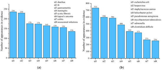 (a) Top 8 diseases with most evidence; (b) top 8 microbes with most evidence.