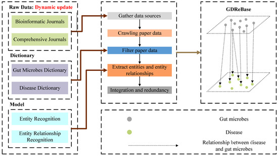 To filter out papers closely related to gut microbes and disease, we download the classification of gut microbes in NCBI and searched through Malacards (https://www.malacards.org/categories) (accessed on 27 November 2022) for information related to disease. These results are used as a dictionary to match titles and abstracts, as well as papers that meet the requirements (microbes ≥ 1, diseases ≥ 1) that are screened as sources of papers for entity relationships in GDReBase.