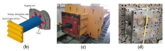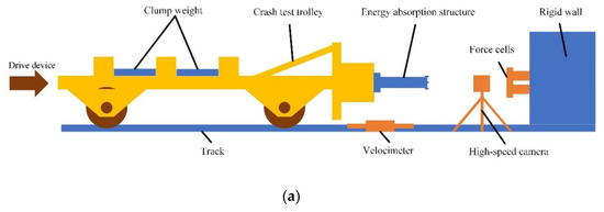 In this study, the dynamic impact test of the full-size cutting-type energy-absorbing structure was carried out, and the test conditions were set up in such a way that the test trolley equipped with the cutting anti-climbing energy-absorbing structure at the front end was counterweighted to 13.6 t and then crashed into the rigid wall located on the other side of the rail track with an initial speed of 5 m/s. Figure 1a shows the test layout schematic, including the full-size cutting energy-absorbing structure, test trolley, track, rigid wall, and data acquisition system. The energy-absorbing structure (Figure 1b) is comprised of a support tool, energy absorption tube, an anti-climb device, and six tools. It was bolted to the front of the trolley (Figure 1c), and four dynamic high-frequency force cells (Figure 1d) were fixed to the rigid wall. The energy-absorbing structure and the force cells were attached with trigger tapes in front for zero-point calibration of the data obtained from the data acquisition equipment. Laser-type speed sensors and high-speed cameras were arranged next to the test track to record the test trolley’s initial crash speed and the specimen’s structural deformation during the test.
