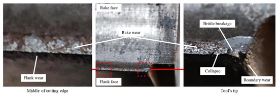 Figure 2 below presents the tool failure mode after the test, which mainly includes noticeable wear of the rake and flank face, deformation, and breakage in the tip area. An indented groove appears on the tool flank face. This formation of grooves on the friction surface parallel to the direction of relative motion is called abrasive wear, a common form of wear on HSS tools. The unevenness on the tool’s rake face is typical adhesion wear. Due to the alternating stress, thermal stress, and structural defects of the tool’s face layer, the material particles on the tool’s face are gradually stuck away by chips or workpieces, which causes adhesion wear of the tool. There are multiple collapses and deformations near the tip of the tool. In the cutting process, the tip and cutting edge will undergo plastic deformation and collapse due to the action of high temperature and high pressure, called transformation wear. It is the main wear form of HSS tools when the cutting temperature exceeds 873 K. There is severe breakage at the tool’s tip. This form of brittle breakage rarely occurs in HSS and other tools with strong toughness. When they face uneven cutting temperatures and shock, if the tool is not sufficiently resistant to thermal cracking impact, excessive thermal stress can form cracks and brittle breakage. Deep grooves, a typical feature of boundary wear, appear near the tip at the junction of the tool’s main and secondary flank faces. The air is not easily accessible in the tool-chip close contact area, and the oxygen supply is sufficient at the edge of this contact area. The tool material reacts with the oxygen in the air to form low-hardness oxides on the surface once the cutting process is at a high temperature. They are easily wiped off by chips or workpieces and form grooves, called oxidation wear, which can seriously lead to the loss of the cutting ability of the tool [13].