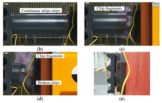 The DE segment (220~360 mm) indicates the severe wear and breakage stage. The tool is severely broken and fails to cut normally, generating many fragmental and broken chips and causing violent force oscillation, as seen in Figure 3d. After the curled chips break, the force decreases slightly. Finally, the curled chip is squeezed by the supporter and tool to the back of the anti-climb creeper device, as seen in Figure 3e. The force increases abruptly, and the collision ends.