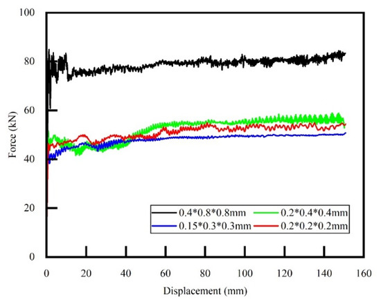 The force–displacement curves for different element sizes are shown in Figure 5. The cutting force of group 1 is significantly higher than those of other groups. In contrast, groups 2 and 3 are close to each other, indicating that the element size has converged, and further refinement will not significantly improve the calculation accuracy. The comparison between group 2 and group 4 suggests that elements have also converged on the aspect ratio. At last, the element size of 0.2 × 0.4 × 0.4 mm is adopted to balance the computational accuracy and efficiency. The cutting area element size in the simulation model is set to 0.2 × 0.4 × 0.4 mm, and the remaining non-cutting area is 1 × 2 × 2 mm.