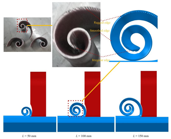 Chip deformation is an essential indicator of the cutting process and characterizes the quality of the developed numerical model. Figure 6 shows chip deformation at cutting displacements of 50, 100, and 150 mm and compares detailed deformation modes between simulation and experiment. It can be observed that both of them have continuous stripe chips with the same curl shape and the same variation pattern on the chip edges. At the beginning of the chips are both irregular edges generated by the initial unsteady cutting, followed by smoothed edges in the steady-state phase. As the chips continue to be generated and curled, the resistance to chip flow increases and the chips are squeezed, resulting in slightly thick buildups and ragged edges.
