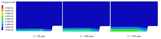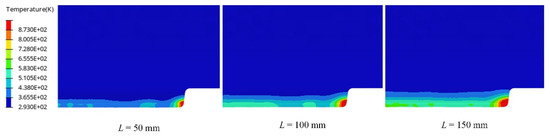 The distribution of the tool temperature field during the cutting process is shown in Figure 7 below. The heat-resistant temperature of the HSS tool is about 873 K, so the upper limit of the cloud temperature is set to the same value to directly observe the area on the tool that exceeds the heat-resistant temperature. It is evident that the highest temperature zone is always concentrated at the tool’s tip and exceeds the material’s heat-resistant temperature. The area constantly expands, and the parts of the experiment where thermal wear occurs are included, as seen in Figure 2. In contrast, the maximum temperature at the middle of the cutting edge is about 570 K, which is lower than the heat-resistant temperature.