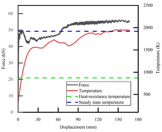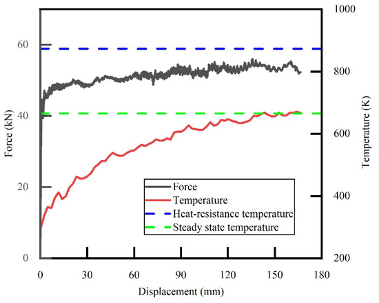 The tool’s maximum temperature versus displacement curve is shown in Figure 12. The tool’s maximum temperature reduces to 670 K, which is 65.10% lower than the original structure (1920 K). Moreover, the temperature in the original design increases sharply in the initial phase (0 to 30 mm). In contrast, the temperature rises gently in the new design all the time, which helps reduce tool’s thermal failure due to thermal shock.