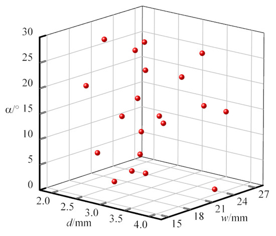 The first step of any population-based optimization is to determine an initial set of sample points by means of design of experiments (DOE) [36]. There are many kinds of DOE methods, including a full factorial design, the Latin hypercube design (LHD), mixture design techniques, and combined design [37]. LHD achieves uniform sampling in multidimensional space and thereby was utilized to sample an initial training set for the surrogate model in this study. Figure 13 illustrates the 20 uniformly distributed sample points obtained by LHD, and Table 3 exhibits the response values obtained from the simulation at the sample points.