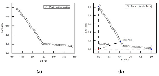 - The Pareto front of multi-objective optimization indicates that SST and MCF competed with each other. and could be well balanced by the minimum distance method. The obtained optimal solution was = 514 K, = 131 kN. The corresponding design variables were , , .