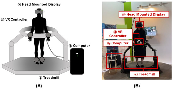 (A) Hardware settings; (B) example set-up at a design exhibition. Logogram VR comprises a head-mounted display, VR controllers, a treadmill, and a computer to execute the software.