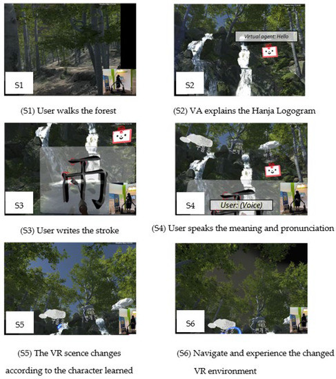 In the system settings that were described earlier, the user walks through the forest to reach the waterfall (S1 of Figure 4). Subsequently, they learn the characters in the order of rain, cloud, and then thunder, considering the difficulty and composition of each word. The game’s VA explains the composition principle of each character and encourages the user to write on the canvas (S2). Once the user writes a character, following the guided stroke sequences (S3), and speaks the meaning and pronunciation of the character to the waterfall (S4), the weather in the VR environment changes according to the character that has been learned (S5). After completing each character, the user can freely move and navigate the forest to experience the changing visual and auditory experiences that the weather brings (S6).