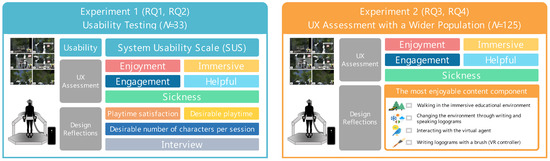 We recruited 125 participants who were visitors (Mage = 27.34, σage = 10.23, Minage = 10, Maxage = 60, Nteenagers = 24, and Nadults = 101) to assess the users’ experiences among a wider population. Fifty-eight participants had some knowledge on at least one Chinese character that had to be learned. The participants had the experiment explained to them and answered a pre-experiment survey including demographic information. We also included questionnaire items on prior experience or knowledge of VR, as these sometimes affect the usability of immersive systems [74]. After experiencing the system, they answered the questionnaires, the UX assessment questionnaires (on enjoyment, immersive, engagement, helpful, and sickness). The participants were also asked to name their favorite aspect of the system to collect design reflection perspectives. The experiment, including the experience and survey, took approximately 15~20 min.