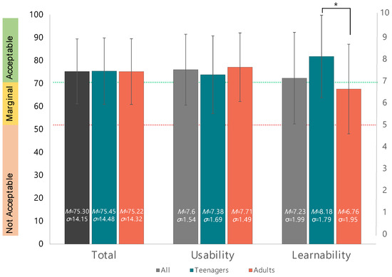 SUS score of Logogram VR (N = 33). Teenagers perceived Logogram VR to be significantly more learnable than adults did (* p < 0.05).