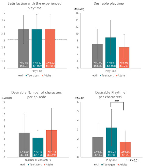 Both the desirable playtime and the desirable number of characters per episode did not produce s statistically significant difference among the age groups. However, what is worth our attention is the individual difference. The average preferred playtime was 7.00 min, with a standard deviation of 4.36. The mean preferred number of characters was 4.00, with a standard deviation of σ = 3.04. A further statistical analysis revealed that prior knowledge and prior experience with VR, as well as age, were not contributing factors. There were no differences between the desired playtime and the number of characters per episode between the age groups, while the individual data were distributed with a large standard deviation.
