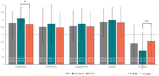 Comparison on the UX with Logogram VR between teenagers and adults (N = 158). Teenagers enjoyed significantly more reported significantly less sickness than adults did (* p < 0.05; ** p < 0.01).