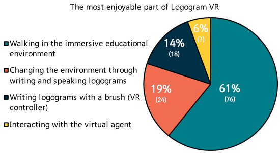 According to eighty percent of the respondents, the embodiment element was the most enjoyable aspect of the system. The most enjoyable part of the program was ‘walking in the immersive educational environment’ (76 participants, 61%), followed by ‘writing logograms using a brush (VR controller)’ (24 participants, 19%), as illustrated in Figure 9. The virtual agent was the least relevant part of game’s enjoyable elements (7 participants, 6%).