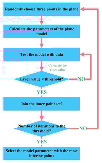 Currently, least squares fitting is the most common and easiest method of fitting a plane; however, the accuracy of least squares fitting is easily affected by noise. With the random sampling consensus algorithm (RANSAC) [26], the influence of noise can be eliminated through an iterative fitting method, which greatly improves the accuracy of the fit. As shown in Figure 1, the flow of the random sampling consensus algorithm is as follows: