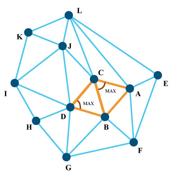 2. Select a point C in the remaining point cloud data to maximize , then place the newly generated two edges AC and BC in the edge table, and place as the first triangle in the triangle. Take any edge from the edge table and assume that it is a BC edge, then the BC edge will divide the plane into two half-planes. Find the discrete point D in the remaining point cloud data. The selection principle is to make the point D and point A different from the same half-plane of the BC side and to maximize . Add the new edges BD and CD to the edge table and to the triangle table.