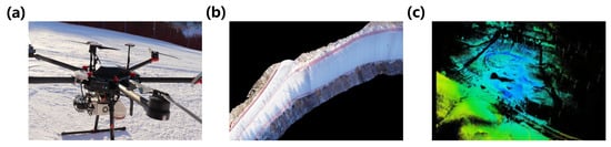 A UAV LiDAR system used to collect data: (a) represents the lidar system; (b) point clouds from the Wanlong Ski Resort; (c) point clouds from the National Cross Country Skiing Center.