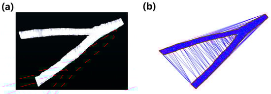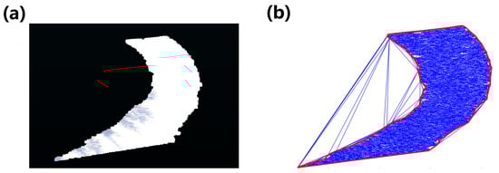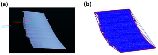 A number of algorithms are available for the calculation of plane point sets, including the incremental method [27], the Graham scan method [28], the volume-wrapping method [29], and the divide-and-conquer method [30]. While Graham’s algorithm is one of the most widely used and efficient algorithms, it is not capable of removing ski-track edge gaps with complex shapes and sizes. The purpose of this paper is to provide an improved method for determining point cloud boundaries, namely an improved growth algorithm, which is used to construct a triangular network using the plane point cloud obtained in Section 2, as shown in Figure 2. In addition, this paper shows that the RANSAC algorithm’s time complexity for plane fitting is O(), while the improved growth algorithm’s time complexity for triangular grid generation is . A triangular network is constructed using the following growth algorithm: