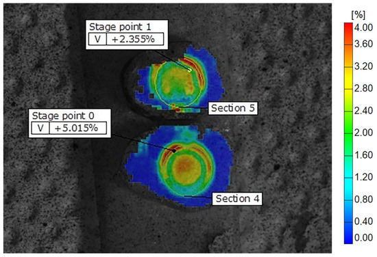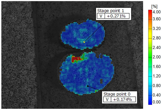 Display of Biodentine deformation fields across the samples on dentine discs, showing peripheral zones with higher and central zones with lower strain values. The color scale indicates different strain values, with the highest marked in red and orange. Some of the recorded reference points are shown as stage points 0 and 1.