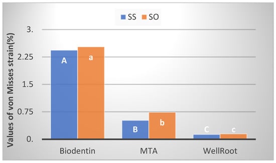 The lower values of von Mises strain of Well-Root PT could be explained by the fact that the material is premixed, injectable and its putty consistency significantly improves its handling characteristics. As a result of the better manipulation ability, a better adaptation of the material to the walls of the perforation cavity can be expected, which will have an effect on the sealing ability of the material. Well-Root PT material is based on tricalcium silicate and it includes zirconium oxide, calcium aluminosilicate and a thickening agent. The presence of aluminosilicate in the powder provides a more rapid setting compared to calcium silicate. There are few published data related to the properties of this material, but there are several studies concerning Well-Root ST sealer from the same manufacturer and based on the same basic components. Well-Root ST demonstrated less microleakage in comparison with other canal sealers. The size of the cement particles ranged from 5 to 30 μm and it does not shrink upon setting [43,49]. Well-Root PT showed alkaline pH, biomineralization properties and had comparable solubility in comparison to Biodentine and MTA [17]. The contact angle indicates the capability of the material to wet the dentin surface or the ability to achieve good adhesion. Research has shown that contact angles, investigated after 10 s, for Biodentin and Well-Root PT were 15° and 9°, respectively [17]. That implies that the bond of Well-Root to dentin could be more favorable than the bond created between Biodentine and dentin.