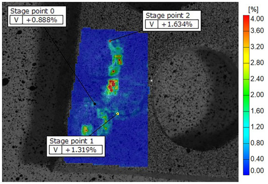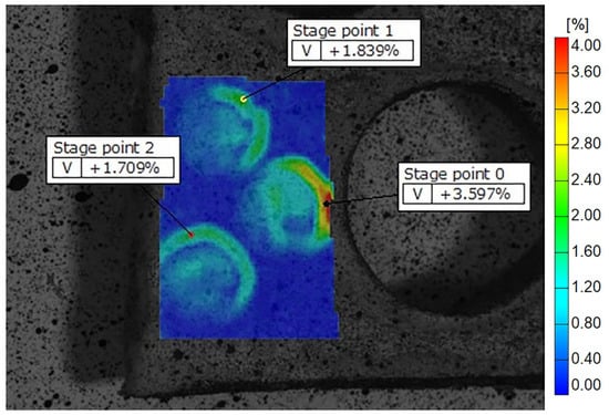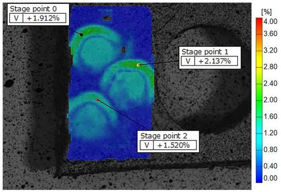Display of Biodentine deformation fields across the samples on Teflon discs, showing peripheral zones with higher and central zones with lower strain values. The color scale indicates different strain values, with the highest marked in red and orange. Some of the recorded reference points are shown as stage points 0, 1 and 2.