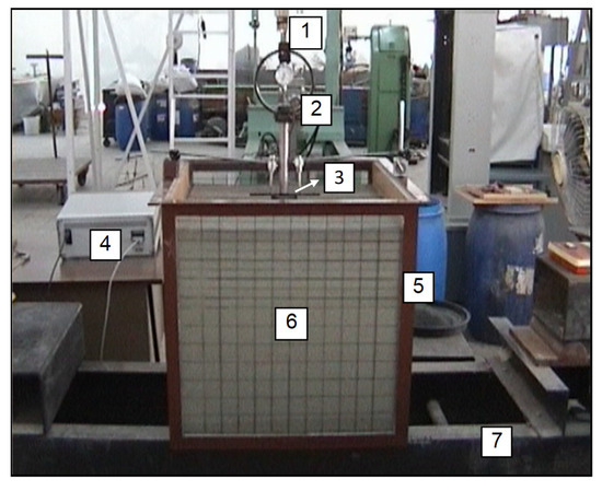Test set-up: (1) mechanical jack; (2) proving ring; (3) model plate; (4) datalogger; (5) steel profile; (6) sand bed; (7) reaction beam.