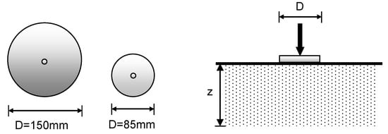Static vertical loads were applied to the model circular footing resting on the sand, with a mechanical jack attached to a loading beam mounted on the test box. Static load values applied to the circular model footing were measured using a comparator and a load ring placed between the jack and the model footing. In the tests, model footings were loaded with a loading rate of 1 mm/min. Loading tests were carried out on circular rigid model footings made of steel material. The diameters of the model footings were 85 and 150 mm, and the thickness was 20 mm (Figure 3).