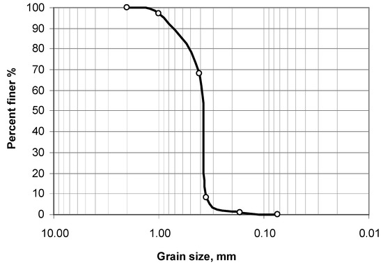 In the experimental study, uniform, clean and fine sand taken from the Seyhan riverbed was used as soil. After the sand material was subjected to pre-washing and sieving processes, it was dried in air, and a sieve analysis test was carried out to determine the particle size distribution in accordance with ASTM D422-63 [24]. It is shown in Figure 4. The classification of the sand material was determined as poorly graded sand (SP) according to the Unified Soil Classification System (USCS). In Table 1, the general physical properties of the sand used in the experiments are summarized.