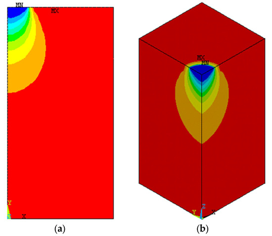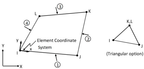 PLANE42 element type is used to model the soil-footing system in 2D modeling (Figure 6). The element is suitable for two-dimensional modeling, axial–symmetrical and plane–strain conditions. PLANE42 element type is defined by four nodes having two degrees of freedom in the nodal x and y directions at each node. The PLANE42 element type, similar to the SOLID45 element type, has the capabilities of plasticity, creep, swelling, stress hardening, large deflection, and large strain.