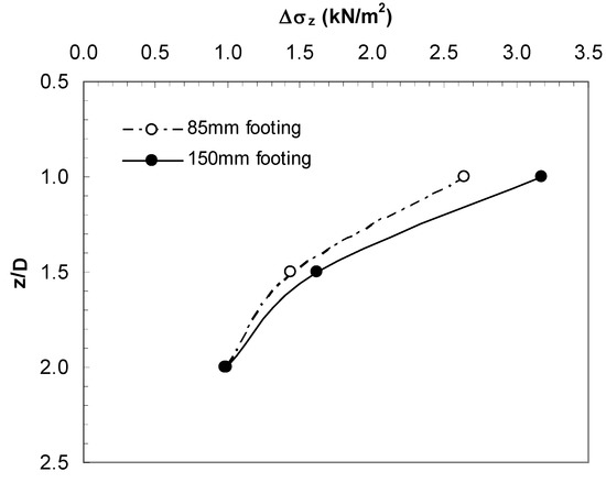 - Test results show that at the same ratio of z/D, vertical stress values increase with increasing the diameter of the footing under the same plate load, especially at shallow depths. It can be concluded that if two footings of various sizes subjected to the constant stress level are placed on the same sand with the same density, the vertical stresses beneath these two footings will be different. In other words, the larger footing produces a greater stress bulb than the smaller footing. The bigger footing produces a larger stress bulb than the smaller footing does. This behavior is observed in numerical analyses of both 2DM and 3DM but not in Boussinesq’s solution because it does not take into account the footing size.