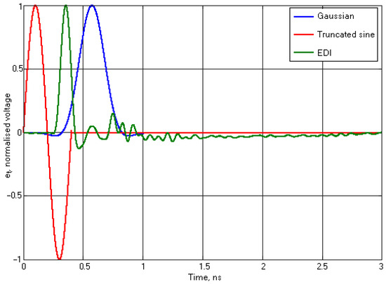 - The sine signal truncated to a single period (Figure 5b), since it provided better results in terms of finding the proper positions in time when analyzing the reflected signals in the developed model of EM wave propagation;