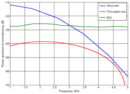 - The Gaussian signal (Figure 5a), since it is continuous and its spectrum due to the Fourier transform properties is also Gaussian, and therefore also continuous. The spectrum of the used Gaussian signal is similar to the spectrum of the radar signal used at the beginning of the project, so this signal was used during simulations of the first data sets for NN training, since the model of the developed EDI radar was not yet developed;