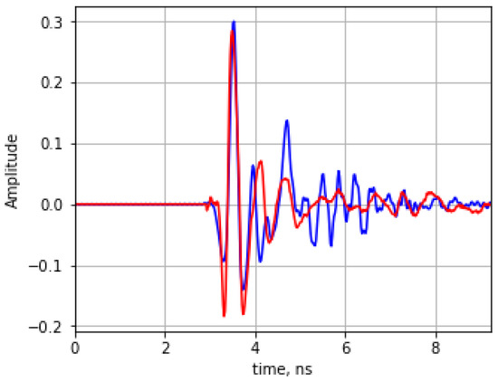 - The signal of the EDI radar (Figure 5c), since it should provide simulation results that were the most similar to the experimental results. The signal of the EDI radar was modeled using the 66 most powerful components of the discrete cosine transform from the recorded EDI radar signal. This signal was used for the generation of synthetic data for NN training and evaluation. This signal was also used for noisy transmitted signal generation, varying, by up to 20%, the DCT coefficient values in order to simulate the imperfectly matching radar signals.