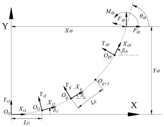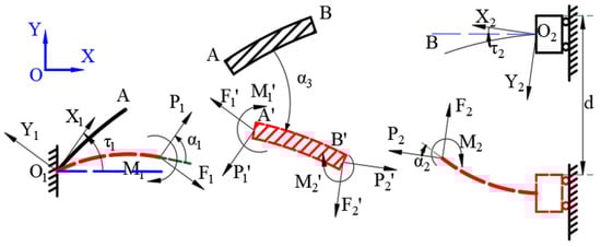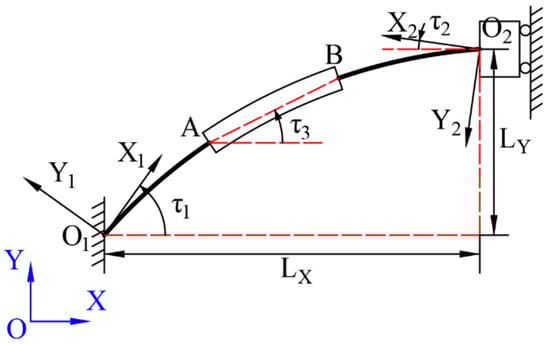 As shown in Figure 7, the local coordinate system is defined at the fixed end, , of the first flexible beam, and the local coordinate system is defined at the fixed end of the second flexible beam. and represent the lengths of the two flexible beams along directions and in the local coordinate systems and , respectively. As the deformation of the rigid beam is much smaller than that of the flexible beam, length of the rigid beam can be expressed as the length of the line connecting points A and B. and represent the angles between local coordinate systems and and natural coordinate system , respectively, and represents the angle between the line connecting points A and B and the X axis in the natural coordinate system. Owing to the geometric nonlinear deformation of the internal flexible beam of the bistable mechanism during motion, modeling is complicated. We adopt the CBCM to describe the flexible bistable mechanism. The CBCM discretizes the initial circular beam into N elements, which are separately modeled using the BCM. Through discretization, the CBCM eliminates the limitation of the BCM for describing curved beams.