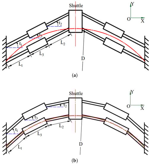Owing to the complex coupling effects among different bistable mechanical properties, it is difficult to modify a specific bistable characteristic without affecting others by just modifying the structure parameters, given a fixed bistable configuration and boundary constraints [21]. Therefore, to improve the pitch stiffness of a bistable mechanism, changes in the other characteristics of the bistable mechanism should be prevented. This improvement can be achieved by reducing the deflection of the shuttle when it is subjected to an off-axis force [22]. Increasing the thickness of the flexible beam increases its twist resistance but affects its nonlinear deformation [23]. In addition, the overall structure becomes larger, which undermines the applicability of flexible bistable mechanisms when a low driving energy and small footprint are required [24].