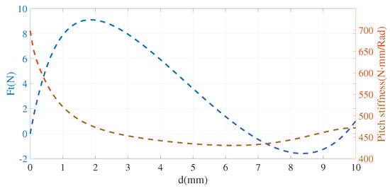 In another finite element simulation, since the deformation process of a bistable mechanism is an instantaneous behavior under the same boundary conditions, we applied the 50 N·mm of torque at different displacement positions of the shuttle using the CBBM model to obtain the corresponding pitch stiffness, which allows us to observe the variation trend of the pitch stiffness of the bistable mechanism in the process of motion; a finite element model can be used to better express the results. The results are shown in Figure 11.