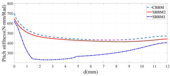 The pitch stiffness of the CBBM is 698.3 (N · mm)/Rad and that of SBBMs 1 and 2 is 607 and 634.2 (N · mm)/Rad, respectively. The pitch stiffness of the CBBM increases by 15.0% and 10.1% compared with that of SBBMs 1 and 2, respectively. At the second stable position, the pitch stiffness of the CBBM is 481.1 (N · mm)/Rad, while that of SBBM 1 is 363 (N · mm)/Rad, and that of SBBM 2 is 426.3 (N · mm)/Rad. Thus, the pitch stiffness of the CBBM increases by 32.5% and 12.8% compared with that of SBBMs 1 and 2, respectively.