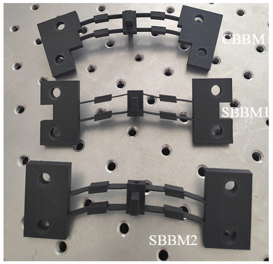 Table 2 lists the simulation and experimental results. The experimental results show that the pitch stiffness of the CBBM at different stable positions is higher than that of the SBBMs. Compared with SBBM1, the pitch stiffness of the CBBM increases by 19.8% at the initial position and 28.2% at the second position. Compared with SBBM2, the pitch stiffness of the CBBM increases by 15.2% at the initial position and 11.5% at the second position. The error of the finite element and experimental results of CBBM is 6.6% at the initial position and 1.8% at the second position. The error of the finite element and experimental results of SBBM1 is 2.3% at the initial position and the error in the second position is 4.8%. The error of the finite element and experimental results of SBBM2 is 1.8% in the initial position and 2.9% in the second position, mainly because of dimension errors during fabrication. Thus, the out-of-plane deformation resistance of the CBBM is higher than that of the SBBM.
