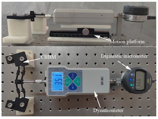 Three prototypes (CBBM and SBBMs 1 and 2) were fabricated using 3D printing based on selective laser sinteringwith HP PA12 nylon with a Young’s modulus of Pa, obtaining the samples shown in Figure 13. The experimental setup established to measure the second stable position of the bistable mechanisms and validate the proposed CBCM is shown in Figure 14. A dynamometer was installed on a uniaxial displacement platform and the displacement data of the platform were read through a digital dial indicator (Mitutoyo 543-390B). We obtained the force–displacement relationship of the flexible bistable mechanism shown in Figure 15.