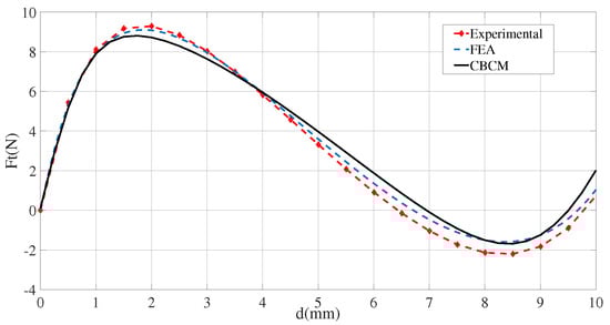 Figure 15 compares the CBBM force−displacement curves predicted by the CBCM and finite element model with the measured curves. The second stable positions of the circular beam expressed by the force−displacement curves obtained from the experiment, model (with the maximum error less than 5%), and simulation suitably agree, indicating the correctness of the derived model. It can be seen that both the kinetostatic model and the finite element model successfully observed the bistable behaviors of CBBM and produced reasonable predictions for the second steady-state positions.