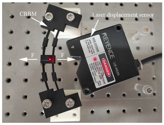To further verify the effectiveness of the compliant CBBM to enhance the pitch stiffness, forces of equal magnitude and opposite directions were applied to the shuttles of CBBM and SBBMs 1 and 2 and a rotational moment was applied to the intermediate shuttle (Figure 16). A laser displacement sensor (KEYENCE LK−H020) was used to measure the rotation of the shuttle body. For each bistable mechanism, the displacement was measured at different stable positions and under the action of no moment. The average values under different moments were then measured to obtain the pitch stiffness.