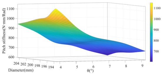 As shown in Figure 18, the pitch stiffness increases with the decreasing diameter. When we keep the total central angle of the bistable limb fixed (i.e., length of the bistable limb does not change), a change in the length of the flexible beam for equal lengths of the two flexible beams decreases the CBBM pitch stiffness with a lengthening flexible segment. For a fixed central angle of the flexible beam, when the diameter of the circular beam gradually changes from 204 to 194 mm, the pitch stiffness increased by 13.5%. For a fixed diameter of the circular beam, when the central angle of the flexible beam gradually changes from 4 to 9, the pitch stiffness decreases by 52%.