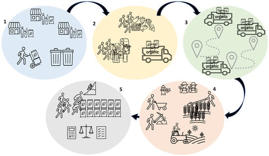 Figure 4. Stages in the valorization of solid waste: 1: source segregation; 2: selective collection; 3: transport of organic solid waste; 4: treatment of organic solid waste and 5: production of organic fertilizer (compost).