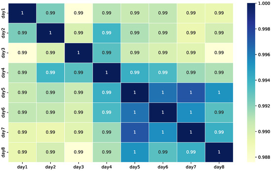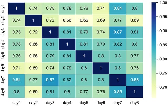 Figure 9 shows that there is a high correlation between the volume of waste observed in commercial buildings during the days of the survey, considering the two groups analyzed. The result observed between Days 7 and 3 (0.87), between Days 7 and 1 (0.84) and between Days 7 and 8 (0.85) can be highlighted. These results show that the consumption of waste observed in the groups has a similar behavior.